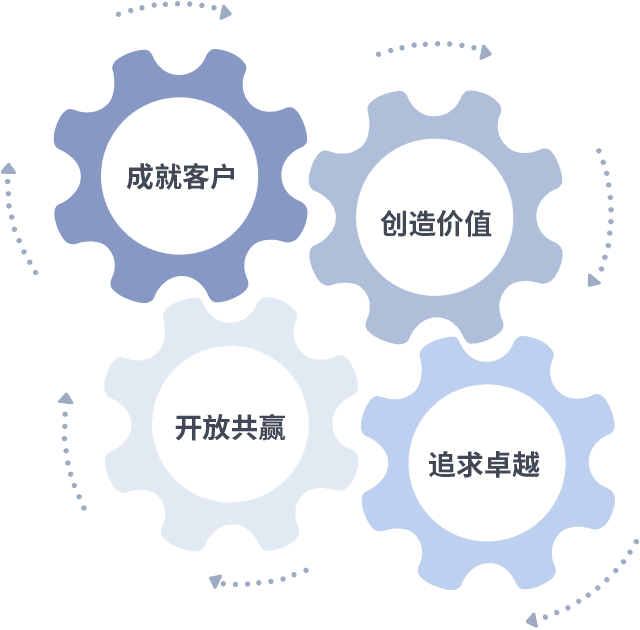 成就客户是一切决策的出发点,,,,创造价值是衡量所有工作的标准,,,追求卓越是我们做事做人的态度,,开放共赢是我们的格局也是最终的结果。。。。价值观的齿轮环环相扣,,,,推动着组织里的每个人不断向前。。。。